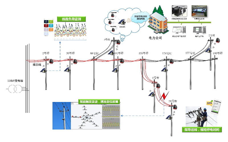 線路發(fā)生故障時觸發(fā)三相同步錄波,獲得各相電場、電流錄波信號,并計算得到零序電流,同一母線下所有出線上安裝的裝置均將故障錄波文件上送至主站,主站結(jié)合各監(jiān)測點上送的故障錄波文件和線路拓?fù)?,完成故障定位和故障分析,通過推圖和短信通知的方式告知運維人員故障定位結(jié)果,縮短故障查找時間,實現(xiàn)快速恢復(fù)故障區(qū)域段供電。