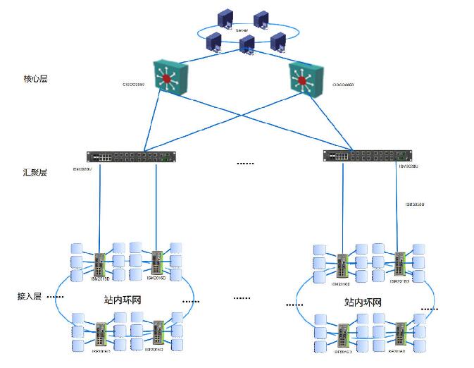 1、該組網(wǎng)方案使用了環(huán)網(wǎng)方案大大提高了網(wǎng)絡(luò)的彈性,任何故障點(diǎn)出現(xiàn)對(duì)目前網(wǎng)絡(luò)不會(huì)造成任何影響。同時(shí)每個(gè)環(huán)網(wǎng)相互獨(dú)立、互不影響。